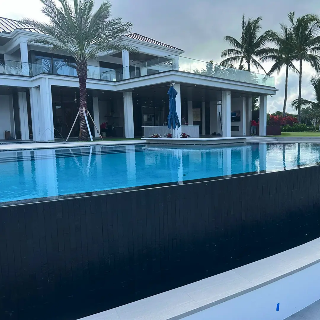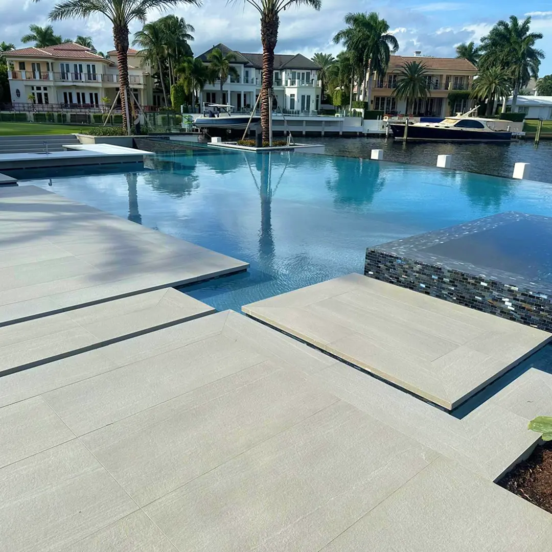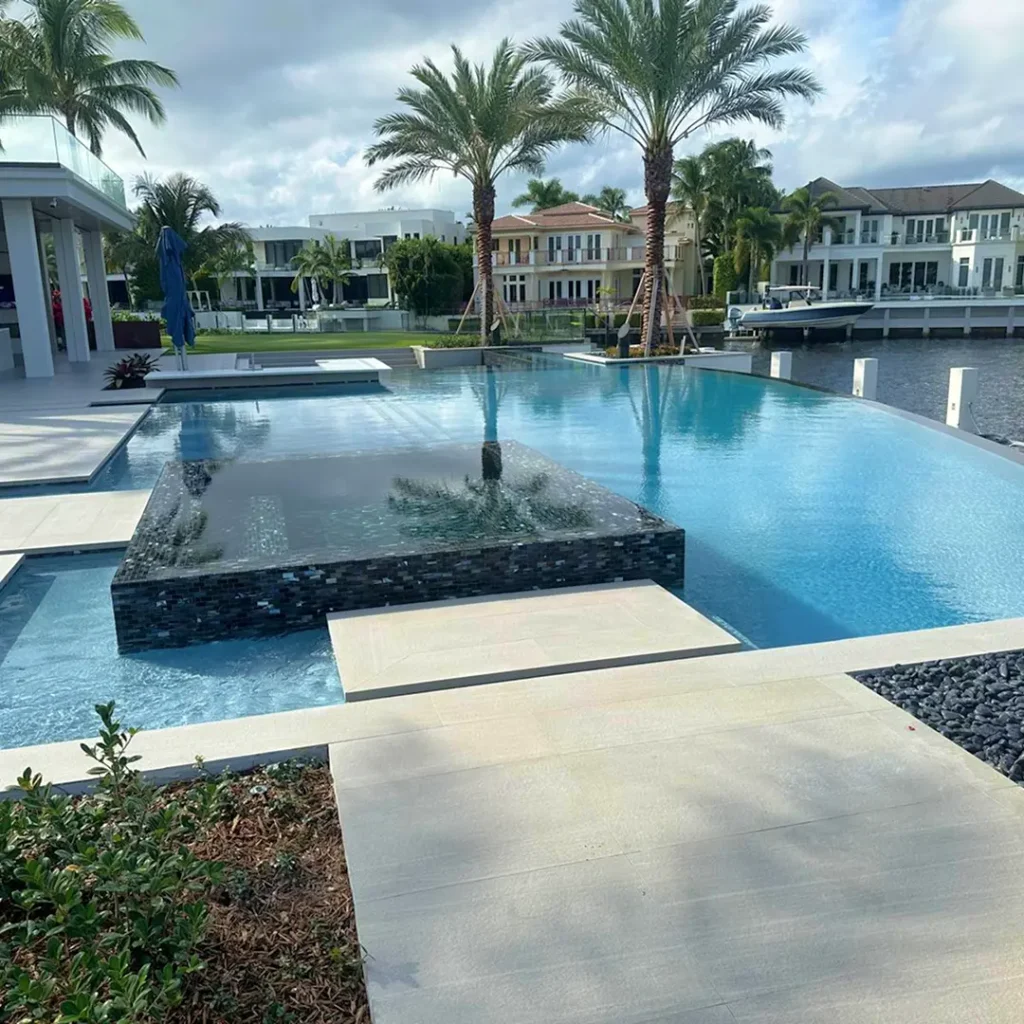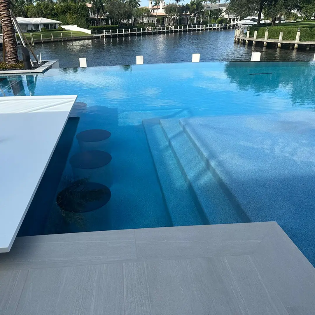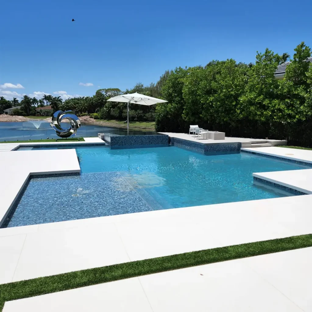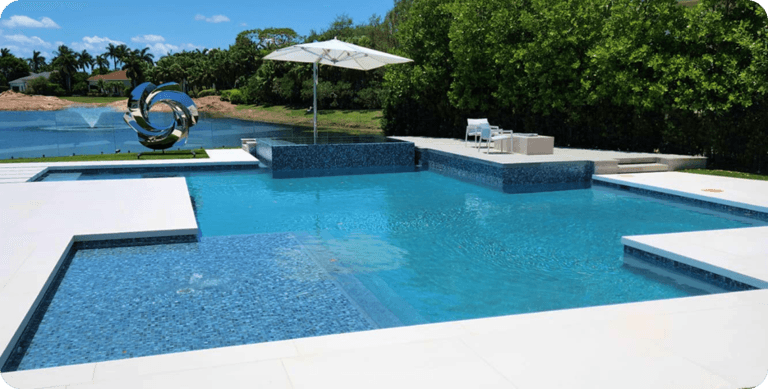 A combination of white, gold, grey and dark brown pebbles creates a light to medium blue water color.