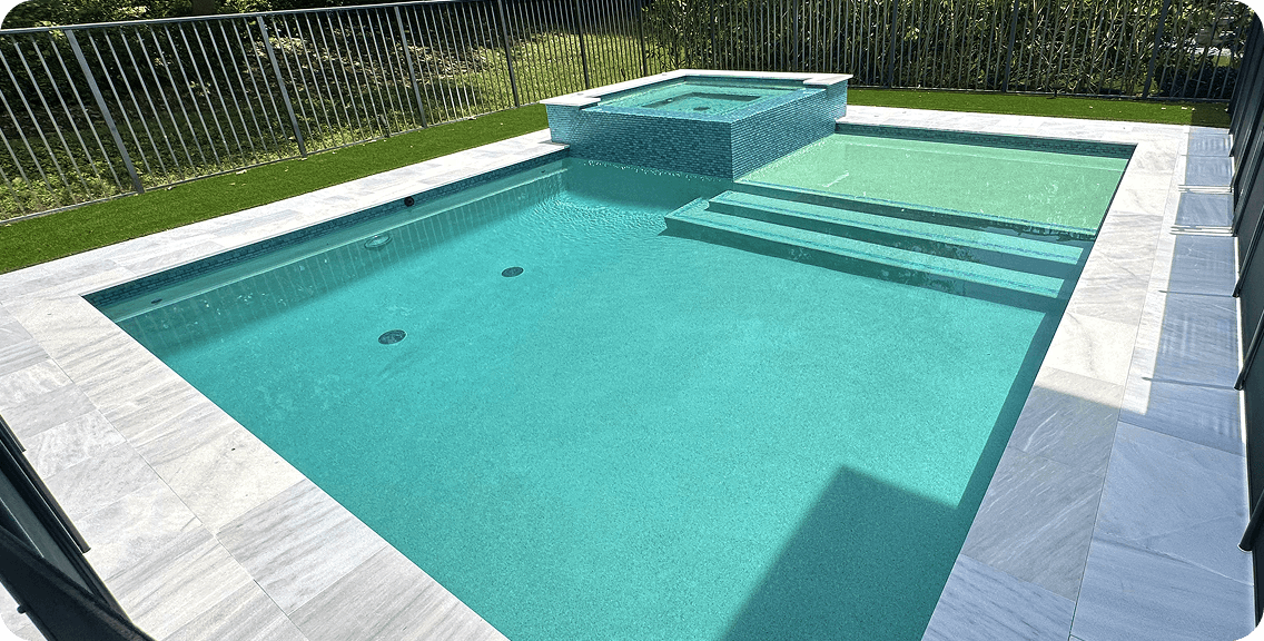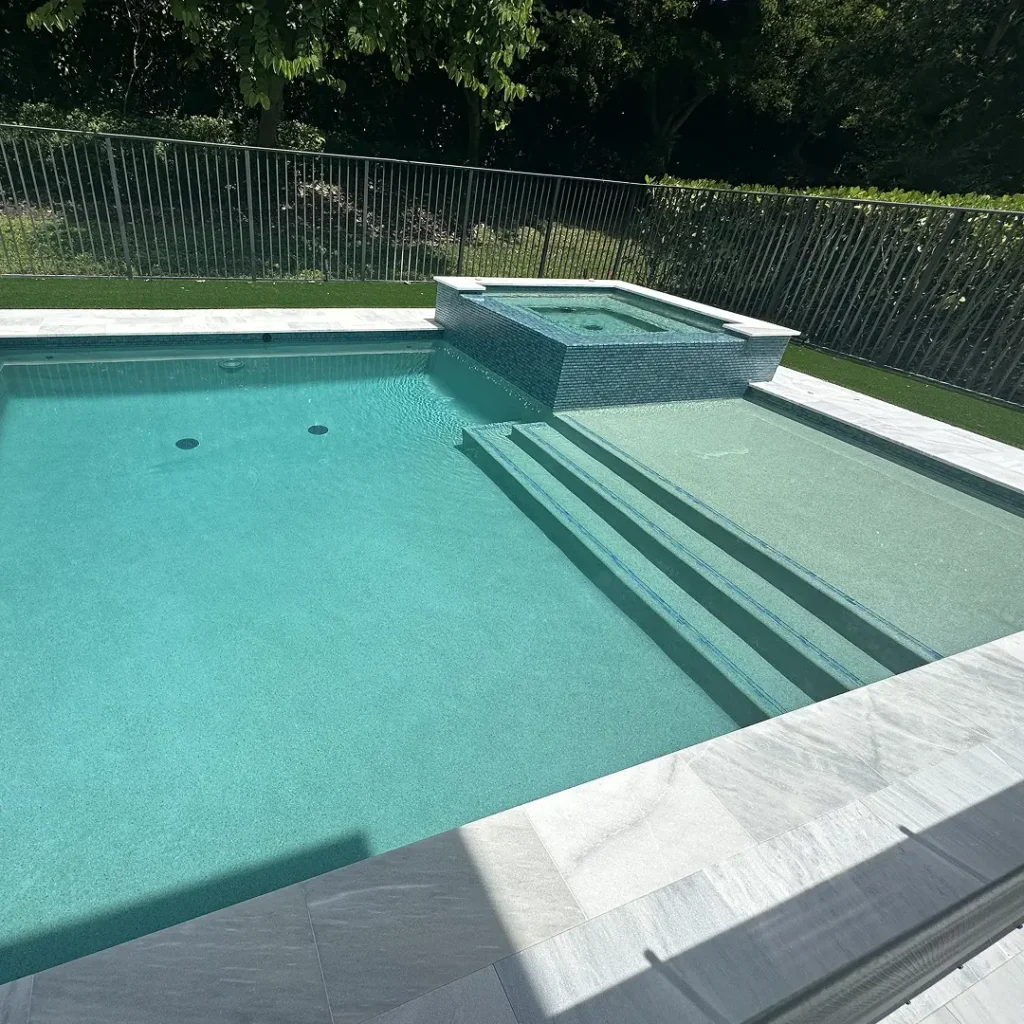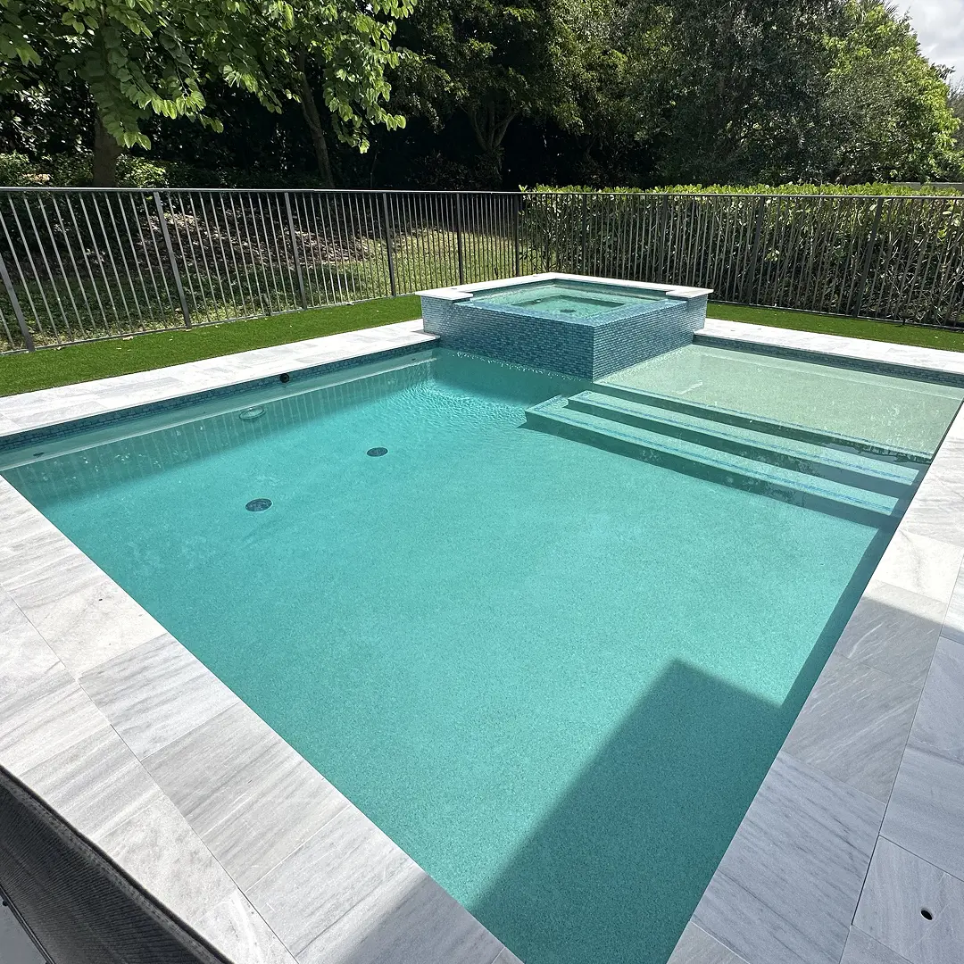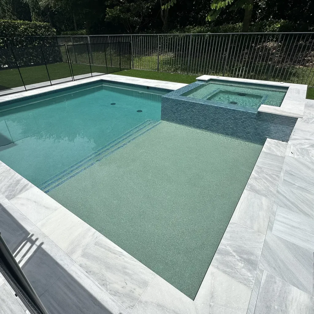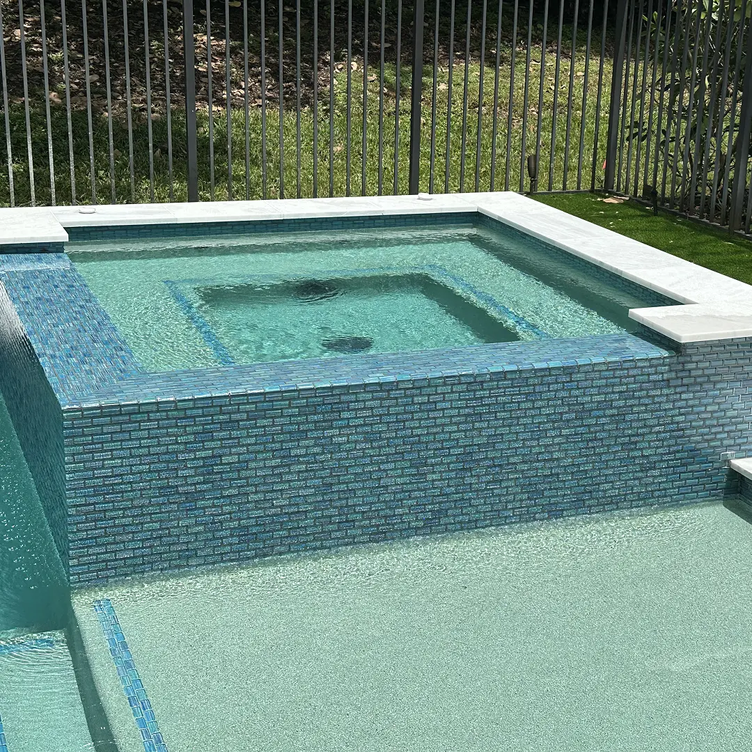 A cool, minty green finish consisting of white, light grey and jade-toned pebbles produces a refreshing, teal water color.